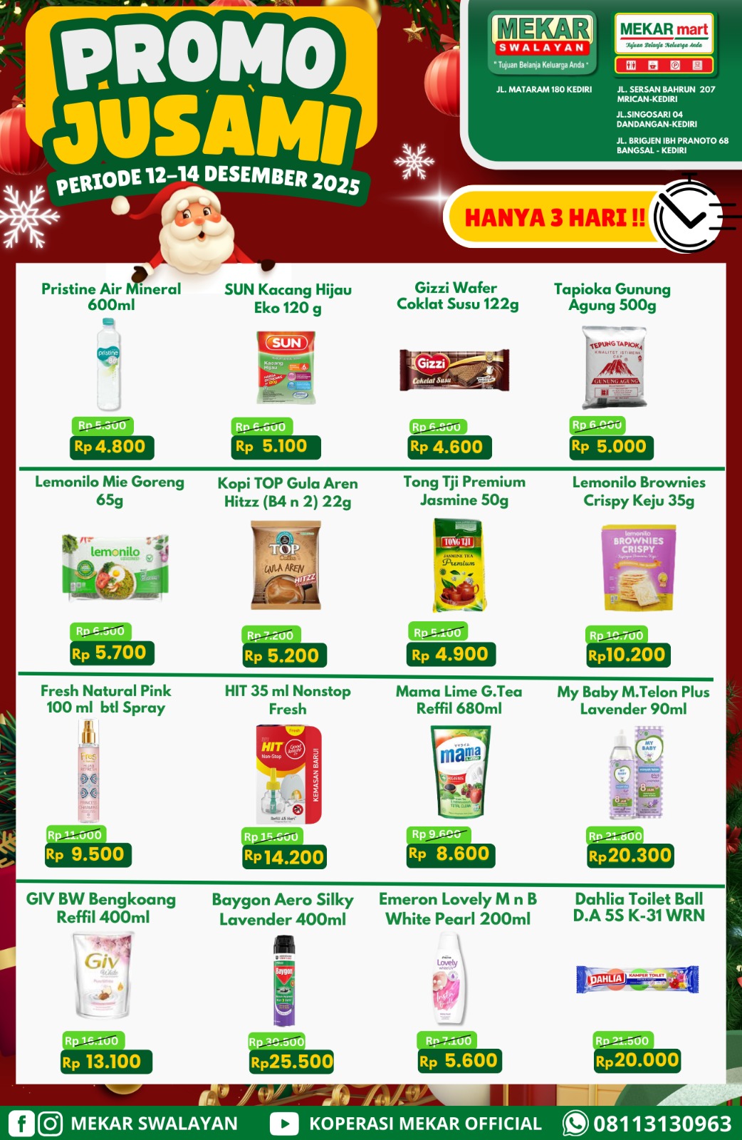PERIODE PROMO TANGGAL 12-14 DESEMBER 2025 ✨PROMO JUSAMI✨MEKAR SWALAYAN , MEKAR MART DAN CORNER POINT 12-14 DESEMBER 2025..Yuk kak segera kunjungi Mekar Swalayan , Mekar Mart & Corner Point karena banyak sekali promo-promo menarik...