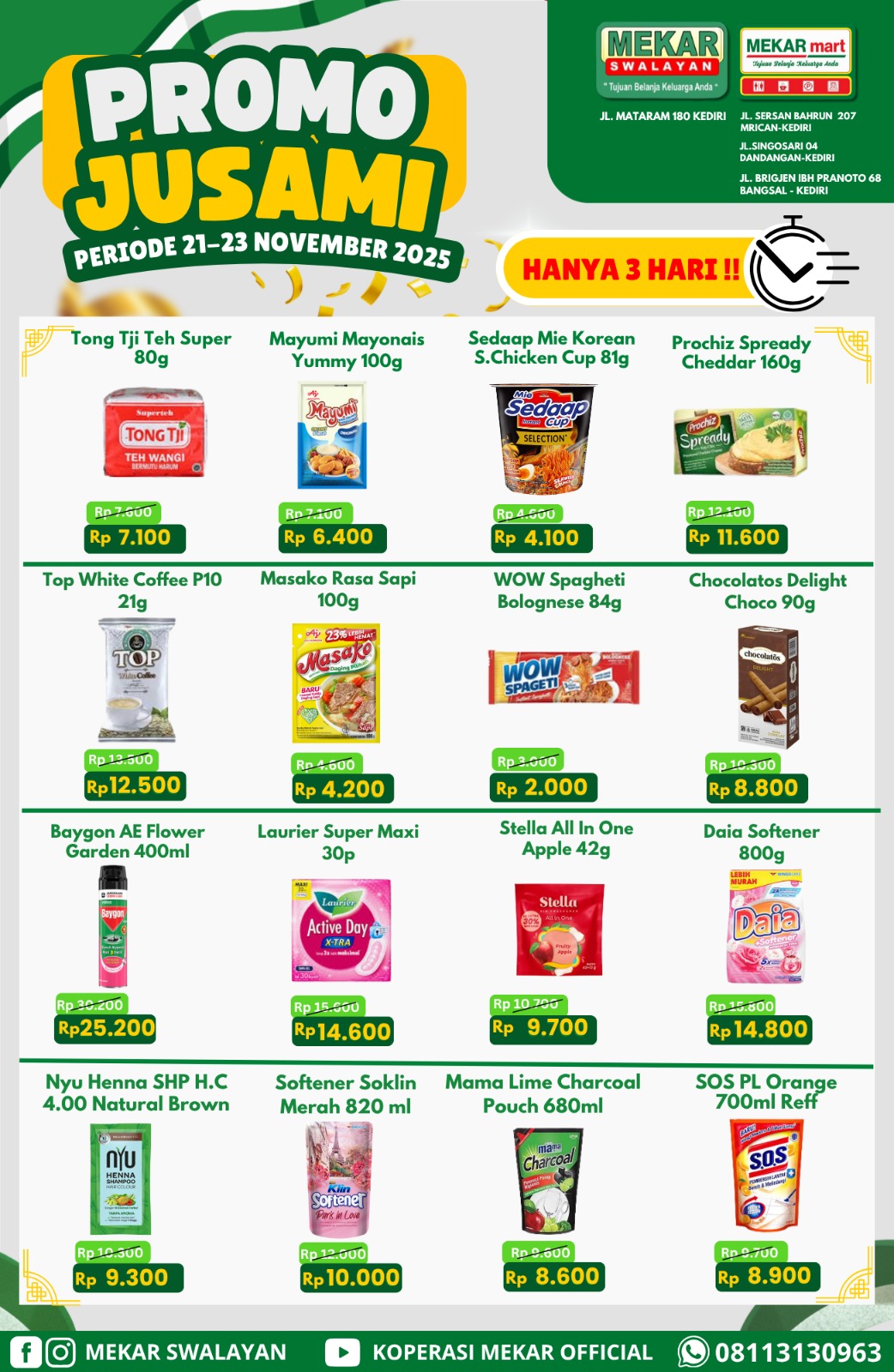 PERIODE PROMO TANGGAL 21-23 NOVEMBER 2025 ✨PROMO JUSAMI✨MEKAR SWALAYAN , MEKAR MART DAN CORNER POINT 21-23 NOVEMBER 2025..Yuk kak segera kunjungi Mekar Swalayan , Mekar Mart & Corner Point karena banyak sekali promo-promo menarik...