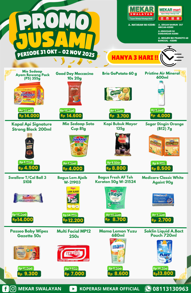 Borong promo JUSAMI berlangsung mulai hari Jumat 31 OKTOBER 2025 sampai dengan hari Minggu tanggal 02 NOVEMBER 2025.