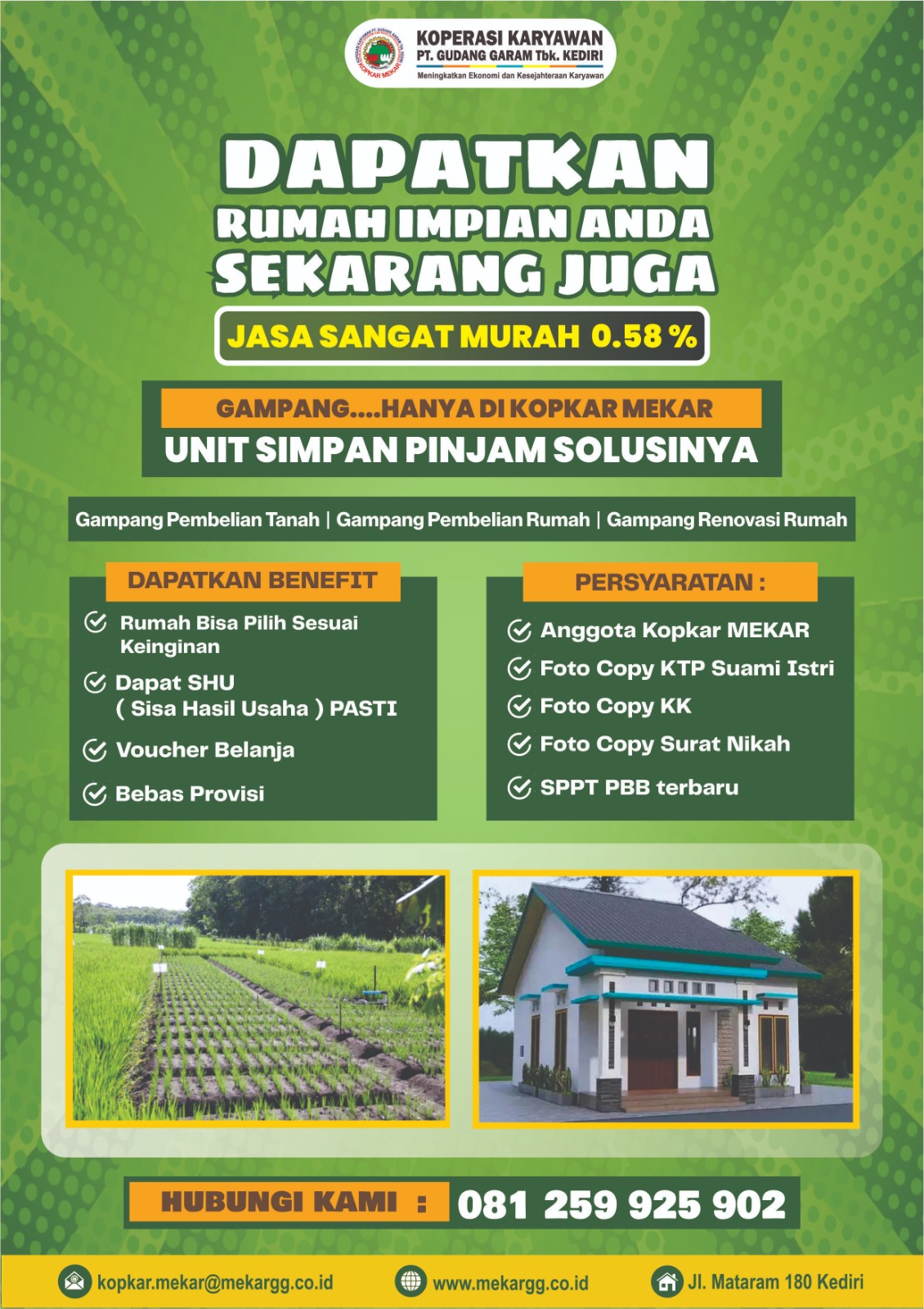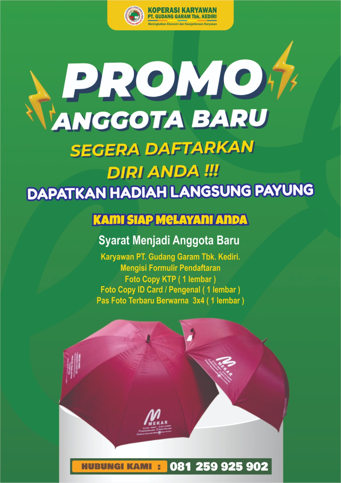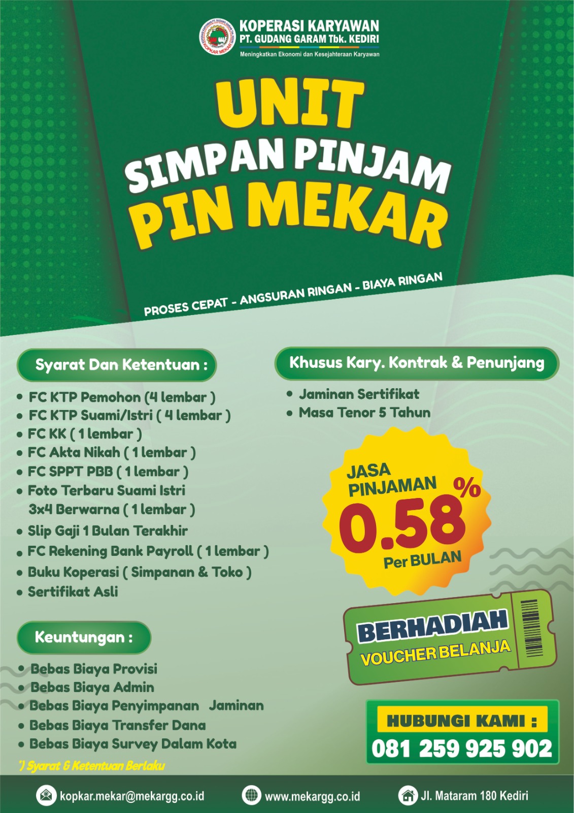 Nikmati fasilitas promo PINJAMAN PIN – MEKAR, pinjaman khusus anggota KOPKAR MEKAR PT. GUDANG GARAM Tbk. KEDIRI dengan benefit : Suku bunga ringan 0,58% flat sampai lunas. Bebas biaya admin. Bebas biaya provisi. Bebas...