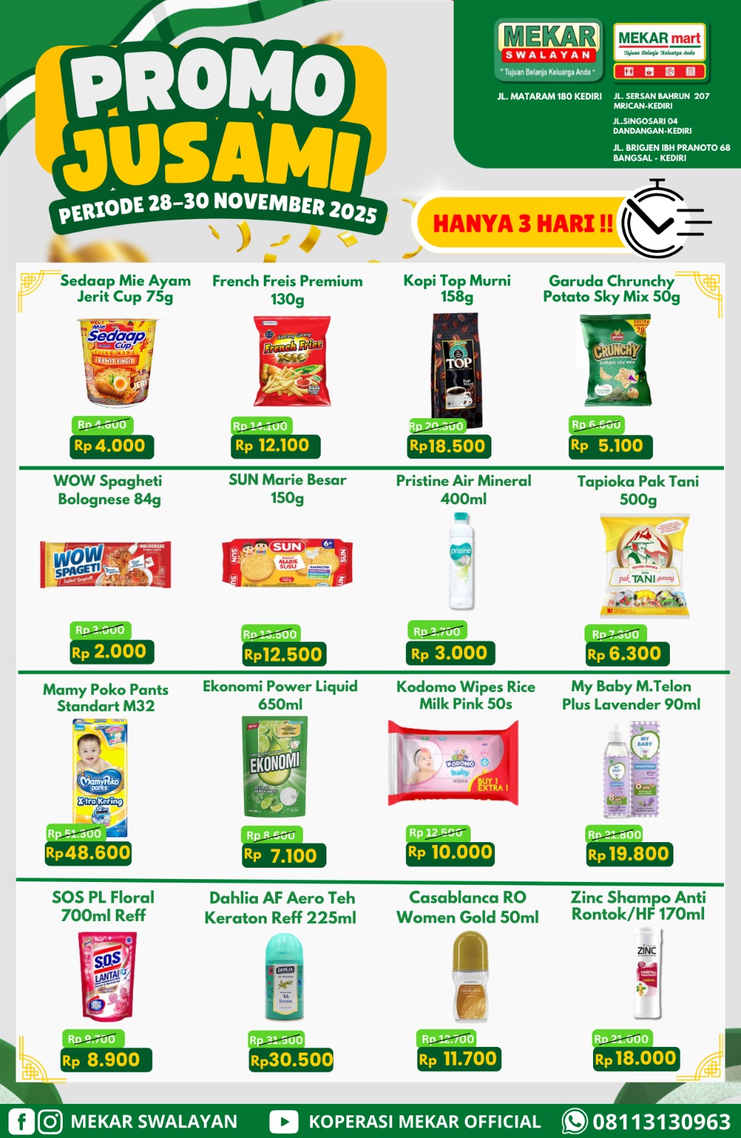 PERIODE PROMO 28-30 NOVEMBER 2025 ✨PROMO JUSAMI✨MEKAR SWALAYAN , MEKAR MART DAN CORNER POINT 28-30 NOVEMBER 2025..Yuk kak segera kunjungi Mekar Swalayan , Mekar Mart & Corner Point karena banyak sekali promo-promo menarik setiap...