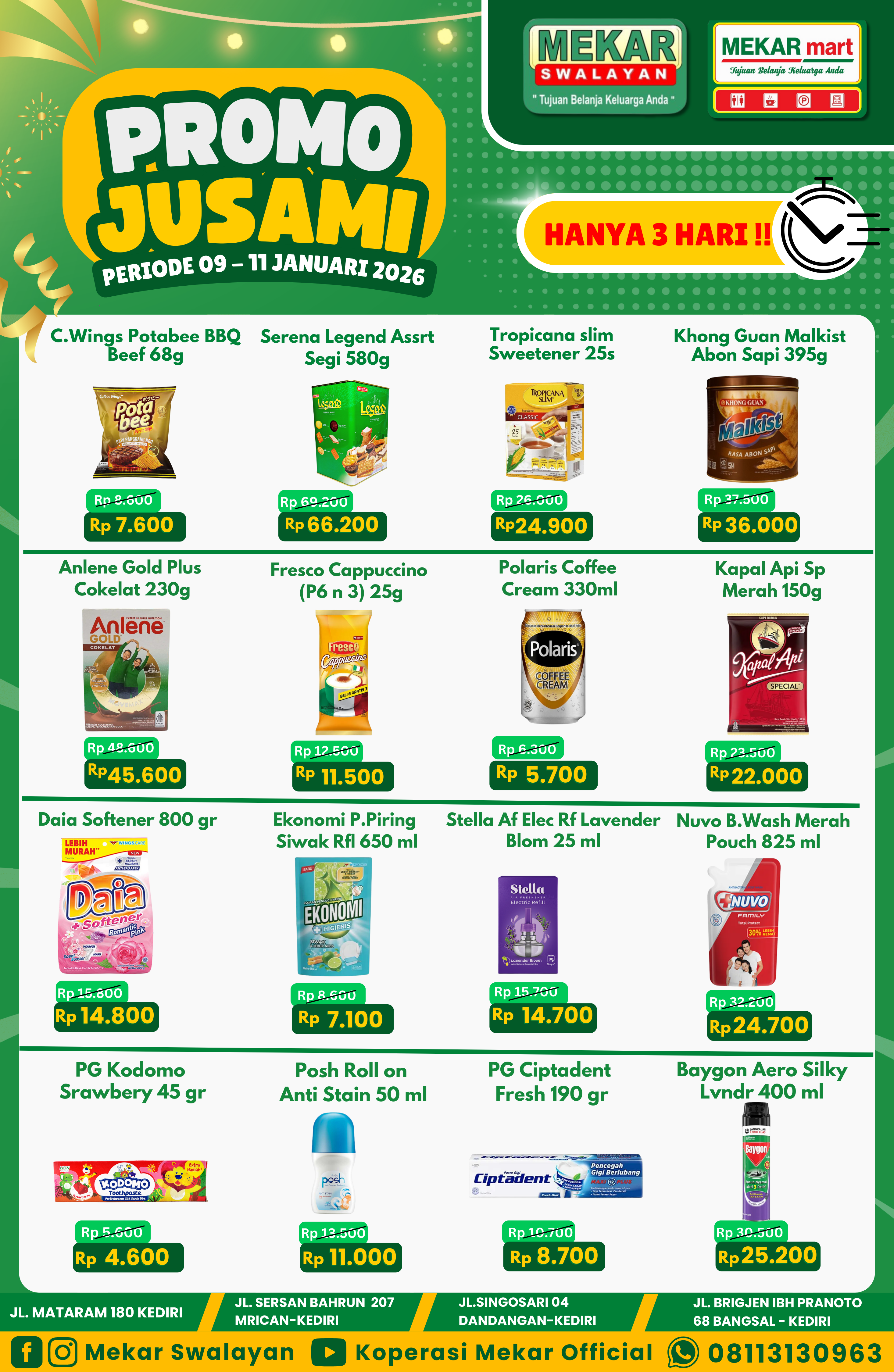 ✨PROMO JUSAMI✨MEKAR SWALAYAN , MEKAR MART DAN CORNER POINT 09-11 JANUARI 2026..Yuk kak segera kunjungi Mekar Swalayan , Mekar Mart & Corner Point karena banyak sekali promo-promo menarik setiap harinya.Borong promo JUSAMI berlangsung mulai...